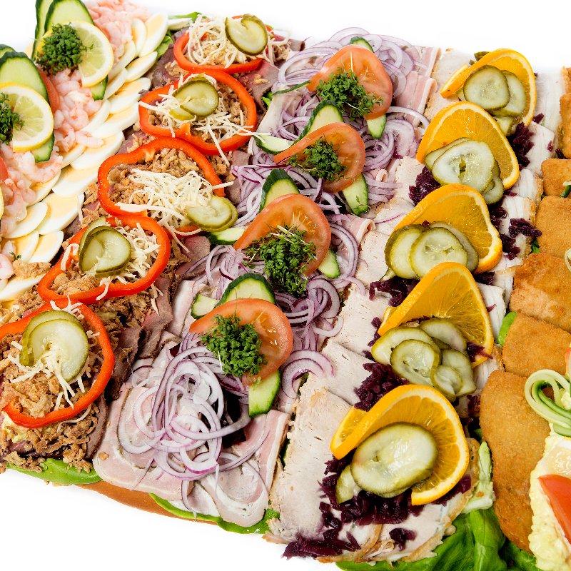 Flot pyntet på lyst brød med 6 slags pålæg: Fiskefilet, hamburgerryg, æg og rejer, leverpostej, flæskesteg og roastbeef.