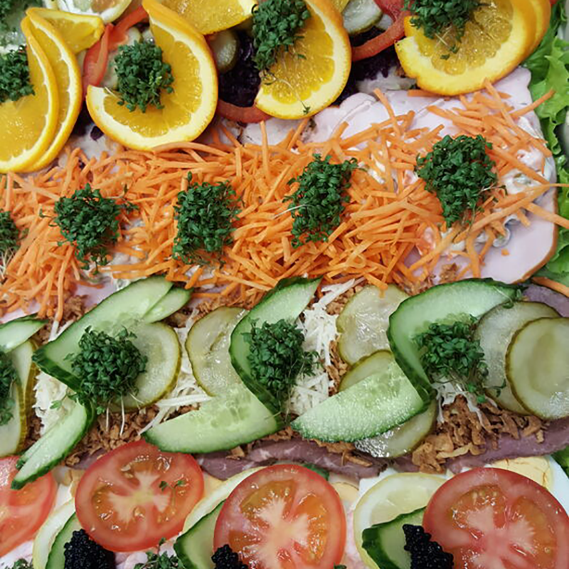 Nok til 6-7 personer. Flot pyntet på groft eller lyst brød med 5 slags pålæg: Fiskefilet, hamburgerryg, æg og rejer, roastbeef, flæskesteg.